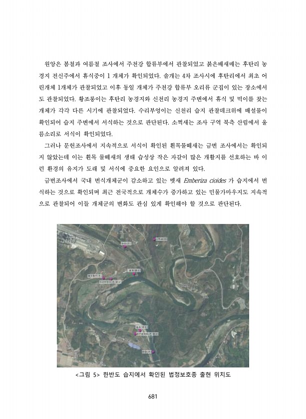 681 원앙은 봄철과 여름철 조사에서 주천강 합류부에서 관찰되었고 붉은배새매는 후탄리 농 경지 전신주에서 휴식중이 1 개체가 확인되었다. 솔개는 4차 조사시에 후탄리에서 최초 어 린개체 1개체가 관찰되었고 이후 동일 개체가 주천강 합류부 오리류 군집이 있는 장소에서 도 관찰되었다. 황조롱이는 후탄리 농경지와 신천리 농경지 주변에서 휴식 및 먹이를 찾는 개체가 각각 다른 시기에 관찰되었다. 수리부엉이는 신천리 습지 관찰데크위에 배설물이 확인되어 습지 주변에서 서식하는 것으로 판단된다. 소쩍새는 조사 구역 북측 산림에서 울 름소리로 서식이 확인되었다. 그러나 문헌조사에서 지속적으로 서식이 확인된 흰목물떼새는 금번 조사에서는 확인되 지 않았는데 이는 흰목 물떼새의 생태 습성상 작은 자갈이 많은 개활지를 선호하는 ...