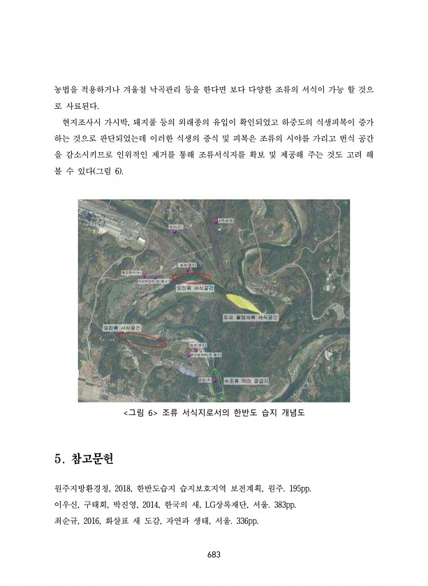 683 농법을 적용하거나 겨울철 낙곡관리 등을 한다면 보다 다양한 조류의 서식이 가능 할 것으 로 사료된다. 현지조사시 가시박, 돼지풀 등의 외래종의 유입이 확인되었고 하중도의 식생피복이 증가 하는 것으로 판단되었는데 이러한 식생의 증식 및 피복은 조류의 시야를 가리고 번식 공간 을 감소시키므로 인위적인 제거를 통해 조류서식지를 확보 및 제공해 주는 것도 고려 해 볼 수 있다 그림 6 그림 6 조류 서식지로서의 한반도 습지 개념도 5. 참고문헌 원주지방환경청, 2018, 한반도습지 습지보호지역 보전계획, 원주. 195pp. 이우신, 구태회, 박진영, 2014, 한국의 새, LG상록재단, 서울. 383pp. 최순규, 2016, 화살표 새 도감, 자연과 생태, 서울.336pp.