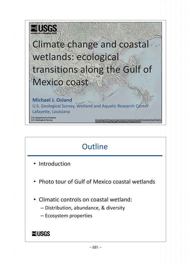 Outline ? Introduction ? Photo tour of Gulf of Mexico coastal wetlands ? Climatic controls on coastal wetland? Distribution, abundance, & diversity ? Ecosystem properties U.S. Department of Interior U.S. Geological Survey Climate change and coastal wetlandsecological transitions along the Gulf of Mexico coast Michael J. Osland U.S. Geological Survey, Wetland and Aquatic Research Center Lafayette, ...