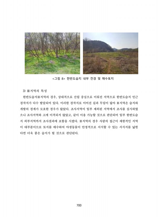 700 그림 8 한반도습지 내부 전경 및 매수토지 3 Ⅲ지역의 특성 한반도습지Ⅲ지역의 경우, 상대적으로 산림 중심으로 이뤄진 지역으로 한반도습지 인근 경작지가 다수 발달되어 있다. 이러한 경작지로 이어진 길과 무덤이 많아 Ⅲ지역은 습지와 개발의 경계가 모호한 경우가 많았다. 조사지역이 일부 제외된 지역에서 조사를 실시하였 으나 조사지역와 크게 이격되지 않았고, 같이 이용 가능할 것으로 판단되어 일부 한반도습 지 외부지역까지 조사결과에 포함을 시켰다. Ⅲ지역의 경우 사람의 접근이 제한적인 지역 이 대부분이므로 토지를 매수하여 야생동물이 안정적으로 서식할 수 있는 서식지를 넓힌 다면 더욱 좋은 습지가 될 것으로판단된다.