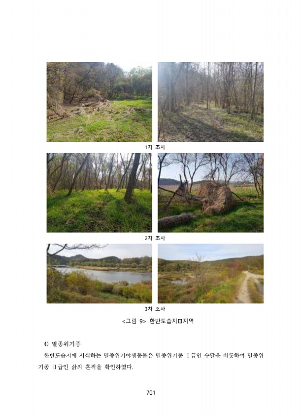 701 1차 조사 2차 조사 3차 조사 그림 9 한반도습지Ⅲ지역 4 멸종위기종 한반도습지에 서식하는 멸종위기야생동물은 멸종위기종 Ⅰ급인 수달을 비롯하여 멸종위 기종 Ⅱ급인 삵의 흔적을확인하였다.