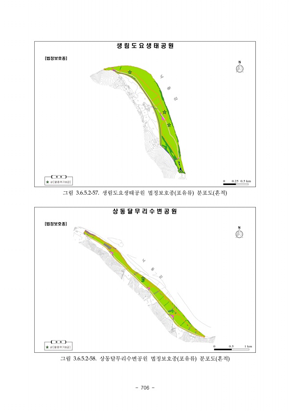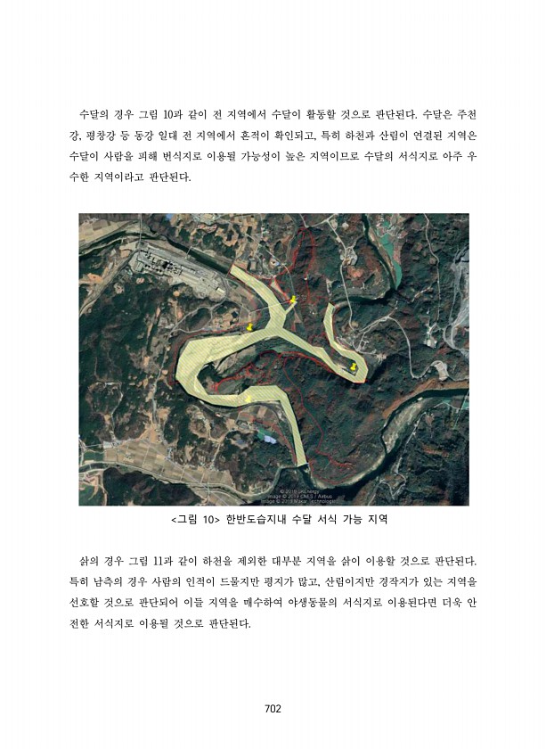 702 수달의 경우 그림 10과 같이 전 지역에서 수달이 활동할 것으로 판단된다. 수달은 주천 강, 평창강 등 동강 일대 전 지역에서 흔적이 확인되고, 특히 하천과 산림이 연결된 지역은 수달이 사람을 피해 번식지로 이용될 가능성이 높은 지역이므로 수달의 서식지로 아주 우 수한 지역이라고 판단된다. 그림 10 한반도습지내 수달 서식 가능 지역 삵의 경우 그림 11과 같이 하천을 제외한 대부분 지역을 삵이 이용할 것으로 판단된다. 특히 남측의 경우 사람의 인적이 드물지만 평지가 많고, 산림이지만 경작지가 있는 지역을 선호할 것으로 판단되어 이들 지역을 매수하여 야생동물의 서식지로 이용된다면 더욱 안 전한 서식지로 이용될 것으로판단된다.
