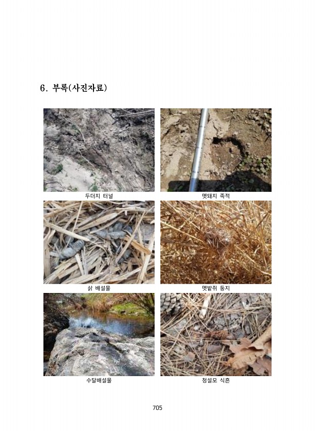 705 6. 부록 사진자료 두더지 터널 멧돼지 족적 삵 배설물 멧밭쥐 둥지 수달배설물 청설모식흔