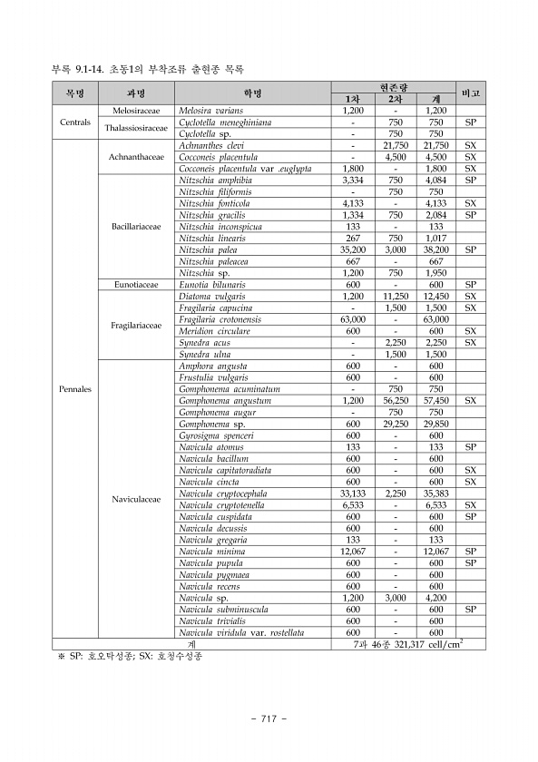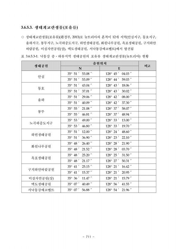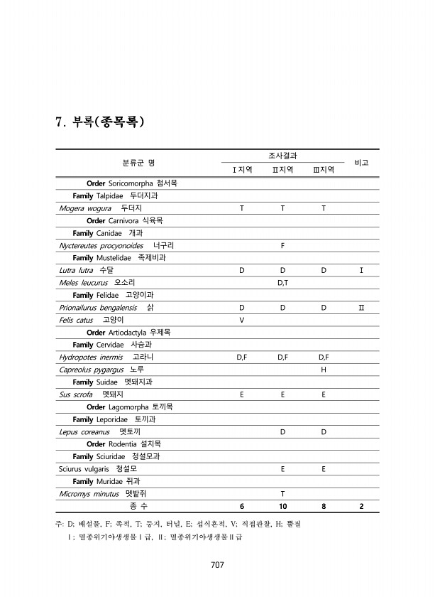 707 7. 부록 종목록 분류군 명 조사결과 비고 Ⅰ지역 Ⅱ지역 Ⅲ지역 Order Soricomorpha 첨서목 Family Talpidae 두더지과 Mogera wogura 두더지 T T T Order Carnivora 식육목 Family Canidae 개과 Nyctereutes procyonoides 너구리 F Family Mustelidae 족제비과 Lutra lutra 수달 D D D Ⅰ Meles leucurus 오소리 D,T Family Felidae 고양이과 Prionailurus bengalensis 삵 D D D Ⅱ Felis catus 고양이 V Order Artiodactyla 우제목 Family Cervidae 사슴과 Hydropotes inermis 고라니 D,F D,F D,F Cap...