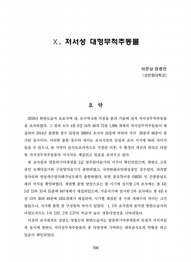 708 Ⅹ. 저서성 대형무척추동물 이준상·정종민 순천향대학교 요 약 2019년 한반도습지 보호지역 내, 유수역 6개 지점을 봄과 가을에 걸쳐 저서성무척추동물 을 조사하였다. 그 결과 모두 4문 6강 14목 40과 72종 1,998 개체의 저서성무척추동믈이 채 집되어 2014년 출현한 종수 52종과 2009년 조사의 24종에 비하여 각각 20종과 48종이 증 가된 종수이다. 이러한 출현 종수의 차이는 조사지점의 선정과 조사 시기에 따라 차이가 있을 수 있으나, 본 지역이 습지보호지역으로 지정된 이후, 수 환경의 개선과 관리로 다양 한 저서성무척추동물의 서식처로 제공되고 있음을 보여주고 있다. 본 조사결과 멸종위기야생생물 2급 염주알다슬기의 서식이 확인되었으며, 한반도 고유 종인 곳체다슬기와 구슬알다슬기가 출현...
