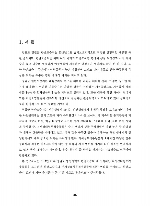 709 1. 서 론 강원도 영월군 한반도습지는 2012년 1월 습지보호지역으로 지정된 전형적인 계류형 하 천 습지이다. 한반도습지는 이미 여러 차례의 학술조사를 통하여 생물 다양성과 서식 개체 수가 높고 다수의 멸종위기 야생생물이 서식하는 안정적인 생태계로 확인 된 바 있다. 또 한 한반도습지 주변에는 석회동굴과 높은 바위절벽 그리고 감압 계류로 인한 곡류천의 특 성을 보이는 우수한 경관 생태적 가치를 지니고 있다. 영월군 한반도습지는 내륙습지의 하구를 제외한 내륙을 제외한 강과 그 주변 장소인 하 천에 해당한다. 이러한 내륙습지는 다양한 생물이 서식하는 서식공간으로 기여함에 따라 생물다양성과 일차생산력이 높은 지역으로 알려져 있다. 또한 내륙과 하천 사이의 전이지 역은 비점오염물질이 정화되어 하천으로 유입...