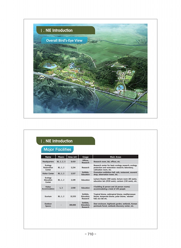 Major Facilities Name Floors Area ㎡ Usage Main Areas Headquarters B1, 1, 2, 3 8,419 Research Offices, Research room, lab, offices, etc. Ecology Restoration Center B1, 1, 2 5,234 Research Research center for basic ecology research, ecology protection and restoration research; laboratory, cultivation room, etc. Visitor Center B1, 1, 2 3,537 Exhibits, Education Promotion exhibition hall, cafe, restau...