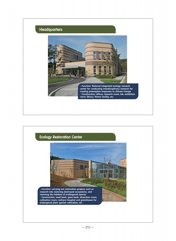 Ecology Restoration Center Functioncarrying out restoration projects such as research into restoring destroyed ecosystems, and restoring the habitats of endangered species Constructionseed bank, gene bank, dissection room, cultivation room, vetinary hospital and greenhouse for endangered plant species cultivation, etc. Headquarters FunctionNational integrated ecology research center for conducting...