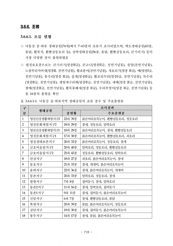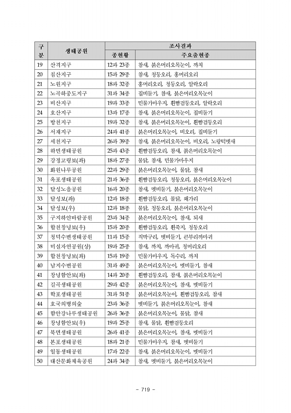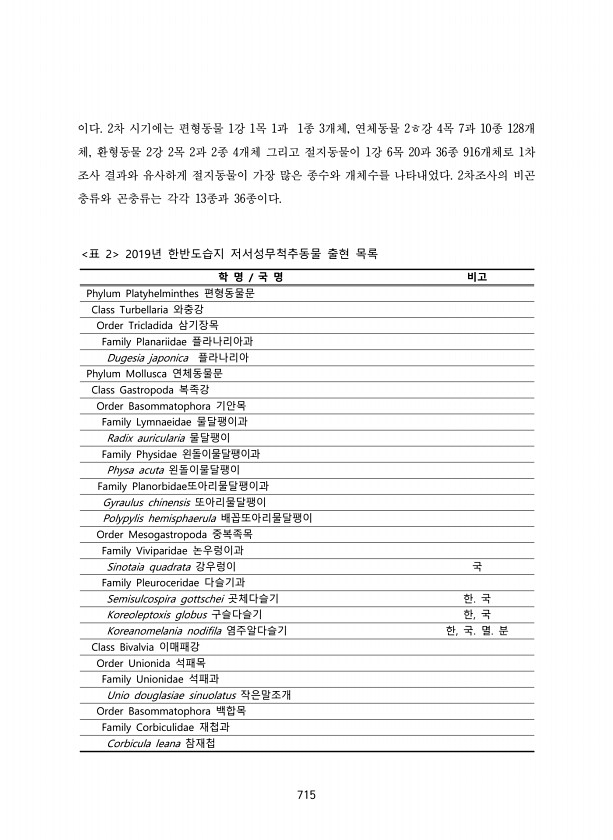 715 이다. 2차 시기에는 편형동물 1강 1목 1과 1종 3개체, 연체동물 2ㅎ강 4목 7과 10종 128개 체, 환형동물 2강 2목 2과 2종 4개체 그리고 절지동물이 1강 6목 20과 36종 916개체로 1차 조사 결과와 유사하게 절지동물이 가장 많은 종수와 개체수를 나타내었다. 2차조사의 비곤 충류와 곤충류는 각각 13종과 36종이다. 학 명 국 명 비고 Phylum Platyhelminthes 편형동물문 Class Turbellaria 와충강 Order Tricladida 삼기장목 Family Planariidae 플라나리아과 Dugesia japonica 플라나리아 Phylum Mollusca 연체동물문 Class Gastropoda 복족강 Order Basommatophora 기안목 Family...
