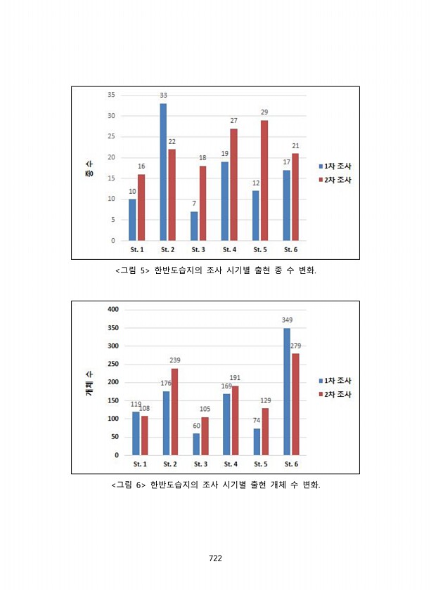 722 그림 5 한반도습지의 조사 시기별 출현 종 수 변화. 그림 6 한반도습지의 조사 시기별 출현 개체 수변화.