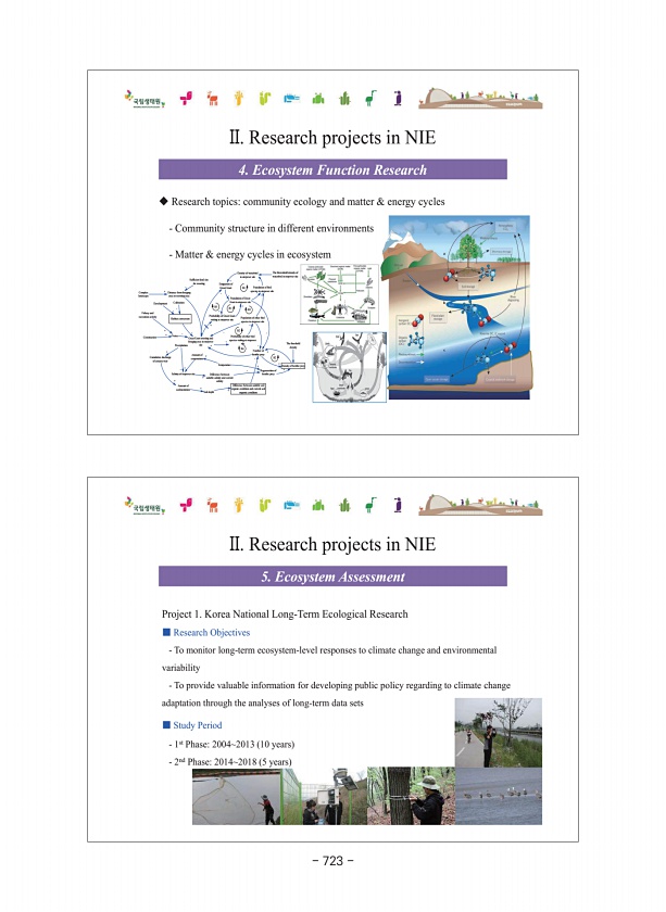 5. Ecosystem Assessment Project 1. Korea National Long-Term Ecological Research ■ Research Objectives To monitor long-term ecosystem-level responses to climate change and environmental variability To provide valuable information for developing public policy regarding to climate change adaptation through the analyses of long-term data sets ■ Study Period 1st Phase20042013 10 years 2nd Phase20142018...