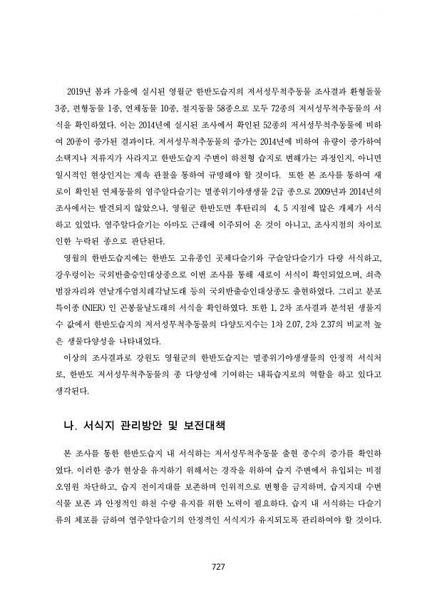 727 2019년 봄과 가을에 실시된 영월군 한반도습지의 저서성무척추동물 조사결과 환형돌물 3종, 편형동물 1종, 연체동물 10종, 절지동물 58종으로 모두 72종의 저서성무척추동물의 서 식을 확인하였다. 이는 2014년에 실시된 조사에서 확인된 52종의 저서성무척추동물에 비하 여 20종이 증가된 결과이다. 저서성무척추동물의 증가는 2014년에 비하여 유량이 증가하여 소택지나 저류지가 사라지고 한반도습지 주변이 하천형 습지로 변해가는 과정인지, 아니면 일시적인 현상인지는 계속 관찰을 통하여 규명해야 할 것이다. 또한 본 조사를 통하여 새 로이 확인된 연체동물의 염주알다슬기는 멸종위기야생생물 2급 종으로 2009년과 2014년의 조사에서는 발견되지 않았으나, 영월군 한반도면 후탄리의 4, 5 지점에 많은 개체...