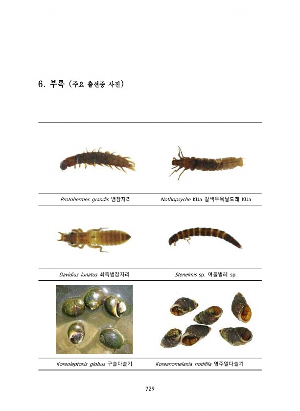 729 6. 부록 주요 출현종 사진 Protohermes grandis 뱀잠자리 Nothopsyche KUa 갈색우묵날도래 KUa Davidius lunatus 쇠측범잠자리 Stenelmis sp. 여울벌레 sp. Koreoleptoxis globus 구슬다슬기 Koreanomelania nodifila염주알다슬기