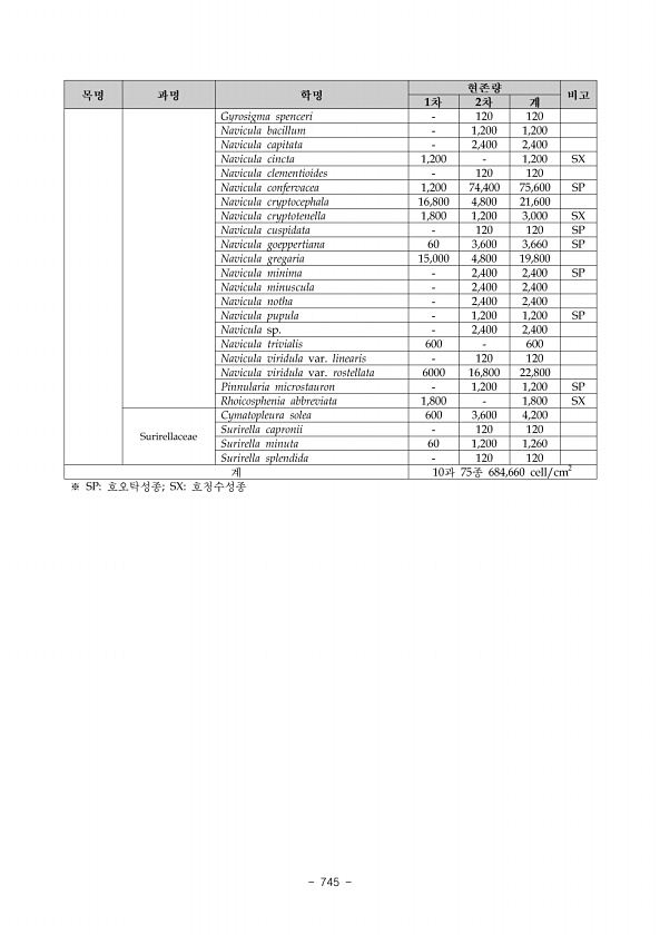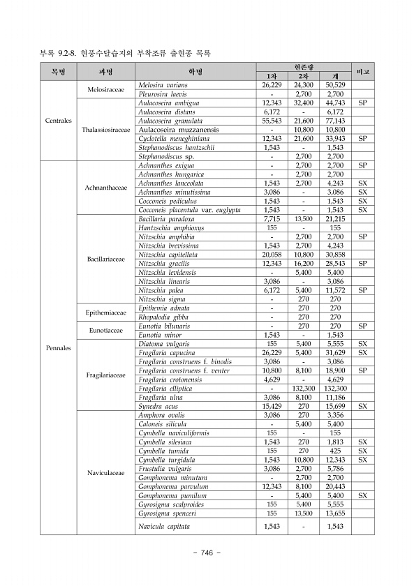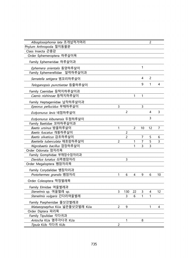 735 Alboglossiphonia lata 조개넙적거머리 2 Phylum Arthropoda 절지동물문 Class Insecta 곤충강 Order Ephemeroptera 하루살이목 Family Ephemeridae 하루살이과 Ephemera orientalis 동양하루살이 1 Family Ephemerellidae 알락하루살이과 Serratella setigera 범꼬리하루살이 4 2 Teloganopsis punctisetae 등줄하루살이 9 1 4 Family Caenidae 등딱지하루살이과 Caenis nishinoae 등딱지하루살이 1 1 Family Heptageniidae 납작하루살이과 Epeorus pellucidus 부채하루살이 3 3 Ecdyonurus levis 네점하루살이 2 4 3...