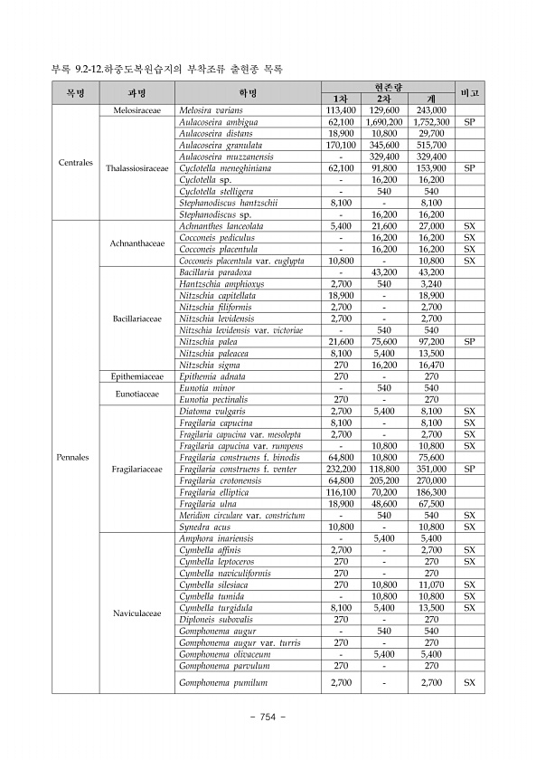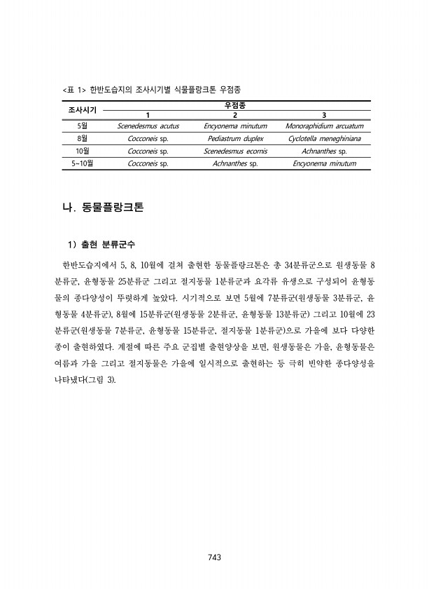 743 조사시기 우점종 1 2 3 5월 Scenedesmus acutus Encyonema minutum Monoraphidium arcuatum 8월 Cocconeis sp. Pediastrum duplex Cyclotella meneghiniana 10월 Cocconeis sp. Scenedesmus ecornis Achnanthes sp. 510월 Cocconeis sp. Achnanthes sp. Encyonema minutum 표 1 한반도습지의 조사시기별 식물플랑크톤 우점종 나. 동물플랑크톤 1 출현 분류군수 한반도습지에서 5, 8, 10월에 걸쳐 출현한 동물플랑크톤은 총 34분류군으로 원생동물 8 분류군, 윤형동물 25분류군 그리고 절지동물 1분류군과 요각류 유생으로 구성되어 윤형동 물의 종다양...