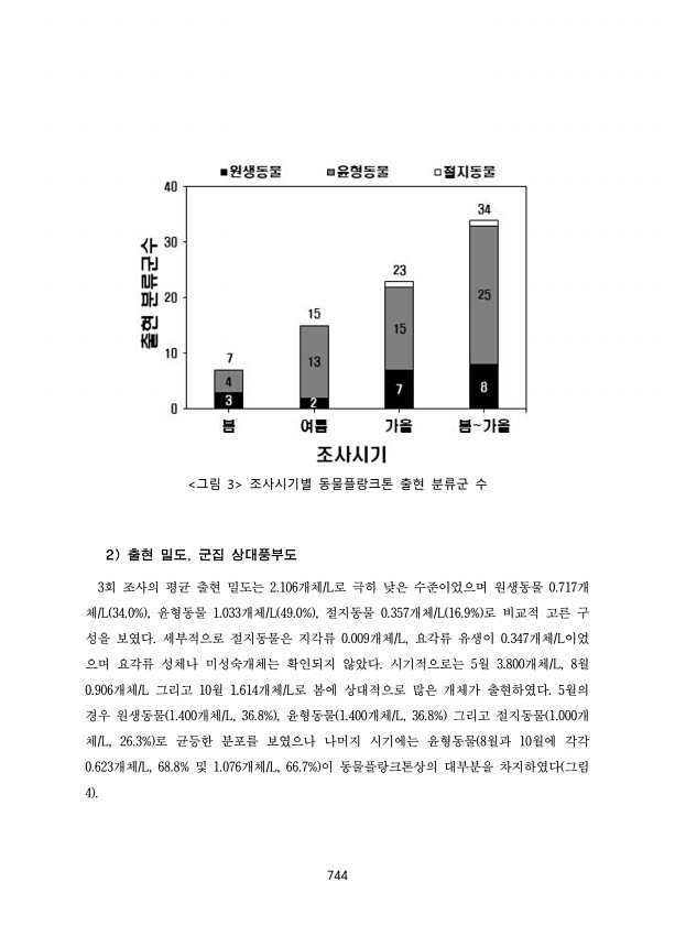 744 그림 3 조사시기별 동물플랑크톤 출현 분류군 수 2 출현 밀도, 군집 상대풍부도 3회 조사의 평균 출현 밀도는 2.106개체/L로 극히 낮은 수준이었으며 원생동물 0.717개 체/L 34.0% , 윤형동물 1.033개체/L 49.0% , 절지동물 0.357개체/L 16.9% 로 비교적 고른 구 성을 보였다. 세부적으로 절지동물은 지각류 0.009개체/L, 요각류 유생이 0.347개체/L이었 으며 요각류 성체나 미성숙개체는 확인되지 않았다. 시기적으로는 5월 3.800개체/L, 8월 0.906개체/L 그리고 10월 1.614개체/L로 봄에 상대적으로 많은 개체가 출현하였다. 5월의 경우 원생동물 1.400개체/L, 36.8% , 윤형동물 1.400개체/L, 36.8% 그리고 절지동물 1.000개 체/L...