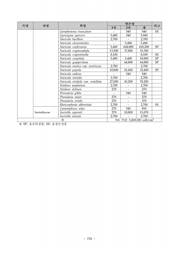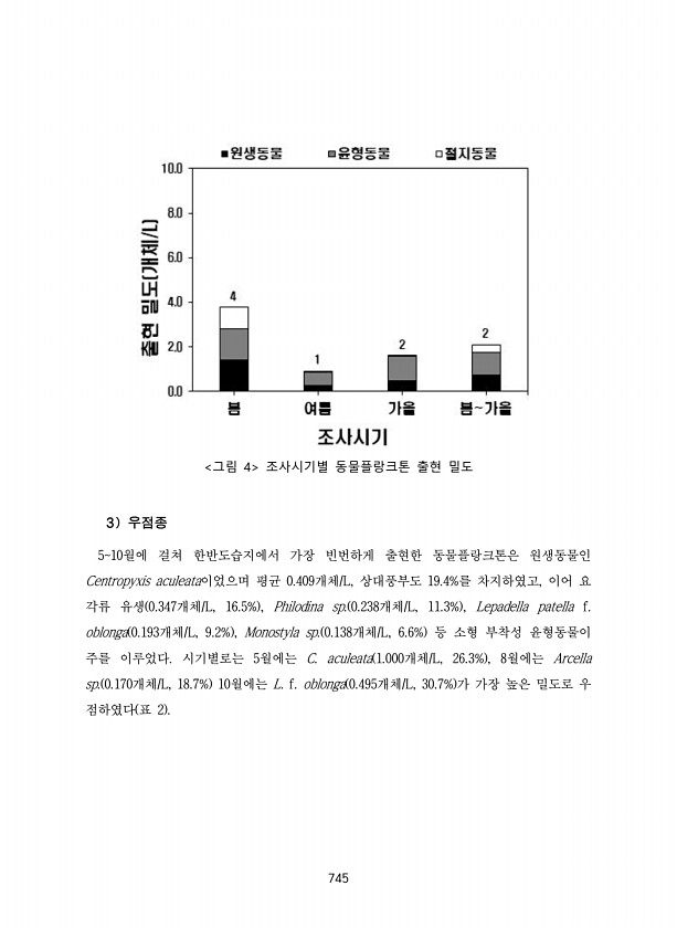 745 그림 4 조사시기별 동물플랑크톤 출현 밀도 3 우점종 510월에 걸쳐 한반도습지에서 가장 빈번하게 출현한 동물플랑크톤은 원생동물인 Centropyxis aculeata이었으며 평균 0.409개체/L, 상대풍부도 19.4%를 차지하였고, 이어 요 각류 유생 0.347개체/L, 16.5% , Philodina sp. 0.238개체/L, 11.3% , Lepadella patella f. oblonga 0.193개체/L, 9.2% , Monostyla sp. 0.138개체/L, 6.6% 등 소형 부착성 윤형동물이 주를 이루었다. 시기별로는 5월에는 C. aculeata 1.000개체/L, 26.3% , 8월에는 Arcella sp. 0.170개체/L, 18.7% 10월에는 L. f. oblonga 0.49...