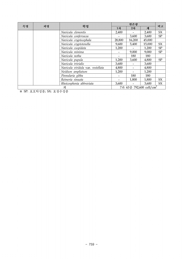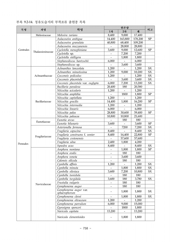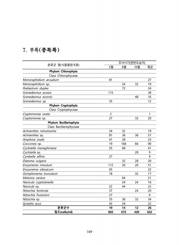 749 7. 부록 종목록 분류군 명 식물플랑크톤 조사시기 한반도습지 5월 8월 10월 평균 Phylum Chlorophyta Class Chlorophyceae Monoraphidium arcuatum 81 27 Monoraphidium sp. 24 32 19 Pediastrum duplex 72 24 Scenedesmus acutus 115 38 Scenedesmus ecornis 48 16 Scenedesmus sp. 35 12 Phylum Cryptophyta Class Cryptophyceae Cryptomonas ovata 2 1 Cryptomonas sp. 27 32 20 Phylum Bacillariophyta Class Bacillariophyceae Achnanthes minutissima ...
