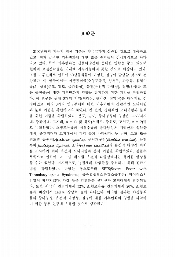 i 요약문 2100년까지 지구의 평균 기온은 약 4℃까지 상승할 것으로 예측하고 있고, 현재 급격한 기후변화에 대한 많은 증거들이 전세계적으로 나타 나고 있다. 특히 기후변화는 생물다양성에 중대한 영향을 주고 있으며 현재의 보전전략들은 미래에 지속가능하지 못할 것으로 예상되고 있다. 또한 기후변화로 인하여 야생동식물에 다양한 질병이 발생할 것으로 전 망된다. 이 연구에서는 야생동식물 소형포유류, 양서류, 파충류, 침엽수 류 의 생태 분포, 밀도, 종다양성 , 유전 유전적 다양성 , 질병 감염률 또 는 출현율 에 대한 기후변화의 영향을 감지하기 위한 기법을 확립하였 다. 이 연구를 위해 3개의 지역 지리산, 월악산, 설악산 을 대상지로 선 정하였고, 위의 3가지 연구주제에 대한 기후기반의 정량적인 모니터링 과...