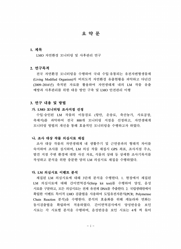 i 요 약 문 1. 제목 LMO 자연환경 모니터링 및 사후관리 연구 2. 연구목적 전국 자연환경 모니터링을 수행하여 국내 수입·유통되는 유전자변형생물체 Living Modified Organism 의 비의도적 자연환경 유출현황을 파악하고 다년간 20092016년 축적된 자료를 활용하여 자연생태계 내의 LM 작물 유출 예방과 사후관리를 위한 대응 방안 구축 및 LMO 안전관리 이행 3. 연구 내용 및 방법 가. LMO 모니터링 조사지점 선정 수입·승인된 LM 작물의 이동경로 항만, 운송로, 축산농가, 사료공장, 축제지 를 파악하여 전국 800개 모니터링 지점을 선정하고, 자연생태계 모니터링 방법의 개선을 통해 효율적인 모니터링을 수행하고자 하였다. 나. 조사 대상 작물 의심시료 채집 조사 대상 작물의 자연생태...