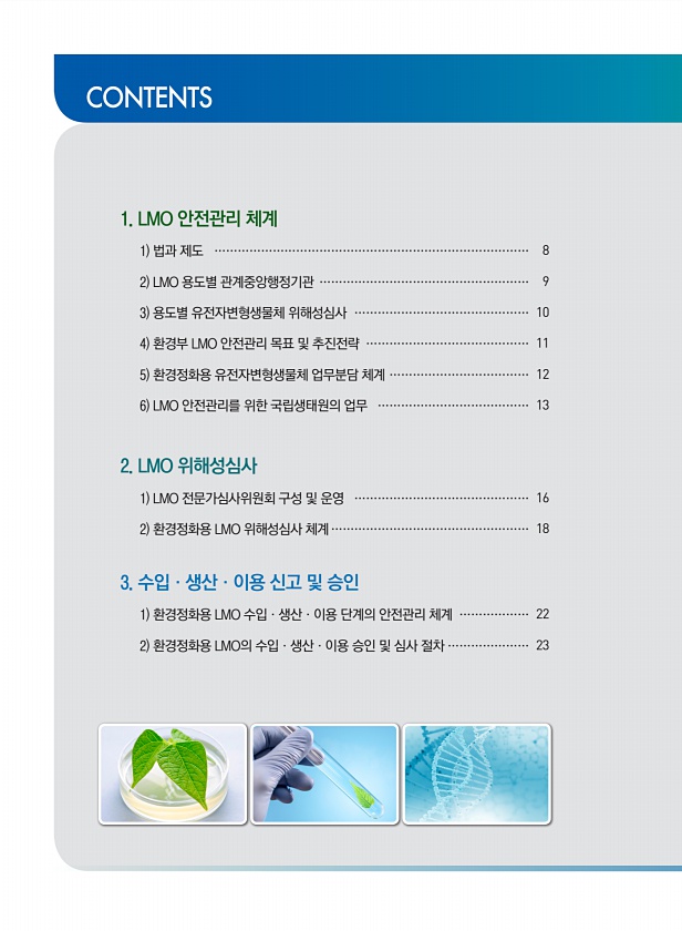 1. LMO 안전관리 체계 1 법과 제도 ……………………………………………………………………… 8 2 LMO 용도별 관계중앙행정기관 ……………………………………………… 9 3 용도별 유전자변형생물체 위해성심사 ……………………………………… 10 4 환경부 LMO 안전관리 목표 및 추진전략 …………………………………… 11 5 환경정화용 유전자변형생물체 업무분담 체계 ……………………………… 12 6 LMO 안전관리를 위한 국립생태원의 업무 ………………………………… 13 2. LMO 위해성심사 1 LMO 전문가심사위원회 구성 및 운영 ……………………………………… 16 2 환경정화용 LMO 위해성심사 체계…………………………………………… 18 3. 수입·생산·이용 신고 및 승인 1 환경정화용 LMO 수입·생산·이용 단계의 ...