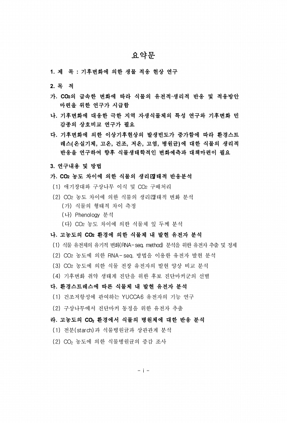 i 요약문 1. 제 목 기후변화에 의한 생물 적응 현상 연구 2. 목 적 가. CO2의 급속한 변화에 따라 식물의 유전적·생리적 반응 및 적응방안 마련을 위한 연구가 시급함 나. 기후변화에 대응한 극한 지역 자생식물체의 특성 연구와 기후변화 민 감종의 상호비교 연구가 필요 다. 기후변화에 의한 이상기후현상의 발생빈도가 증가함에 따라 환경스트 레스 온실기체, 고온, 건조, 저온, 고염, 병원균 에 대한 식물의 생리적 반응을 연구하여 향후 식물생태학적인 변화예측과 대책마련이 필요 3. 연구내용 및 방법 가. CO2 농도 차이에 의한 식물의 생리 생태적 반응분석 1 애기장대와 구상나무 이식 및 CO2 구배처리 2 CO2 농도 차이에 의한 식물의 생리 생태적 변화 분석 가 식물의 형태적 차이 측정 나 Phenolo...