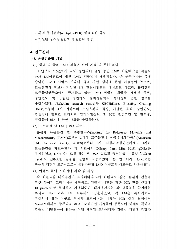 ii 최적 동시검출 multiplex-PCR 반응조건 확립 개발된 동시검출법의 검출한계 검증 4. 연구결과 가. 단일검출법 개발 1 국내 및 국외 LMO 검출법 관련 자료 및 문헌 검색 `11년부터 `16년까지 국내 승인되어 유통 중인 LMO 가운데 5종 작물의 49개 LM이벤트에 대한 LMO 검출법이 개발되었다. 본 연구과제는 국내 승인된 LMO 이벤트 가운데 국내 자연 생태계 혼입 가능성이 높으며, 표준물질의 확보가 가능한 4개 단일이벤트를 대상으로 하였다. 유럽연합 표준물질연구소에서 공개하고 있는 LMO 작물의 개발사, 개발된 목적, 승인연도 및 삽입된 유전자의 분자생물학적 특이성에 관한 정보를 수집하였다. JRC Joint research centre 와 KBCH Korea Biosafety Clea...