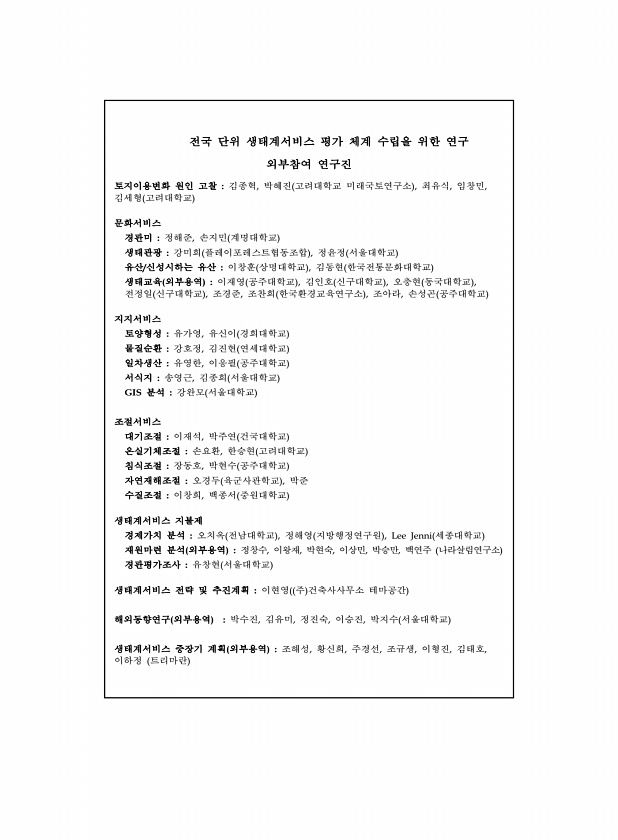 전국 단위 생태계서비스 평가 체계 수립을 위한 연구 외부참여 연구진 토지이용변화 원인 고찰 김종혁, 박혜진 고려대학교 미래국토연구소 , 최유식, 임창민, 김세형 고려대학교 문화서비스 경관미 정해준, 손지민 계명대학교 생태관광 강미희 플레이포레스트협동조합 , 정윤정 서울대학교 유산/신성시하는 유산 이창훈 상명대학교 , 김동현 한국전통문화대학교 생태교육 외부용역 이재영 공주대학교 , 김인호 신구대학교 , 오충현 동국대학교 , 전정일 신구대학교 , 조경준, 조찬희 한국환경교육연구소 , 조아라, 손성곤 공주대학교 지지서비스 토양형성 유가영, 유신이 경희대학교 물질순환 강호정, 김진현 연세대학교 일차생산 유영한, 이응필 공주대학교 서식지 송영근, 김종희 서울대학교 GIS 분석 강완모 서울대학교 조절서비스 대기조절 이...