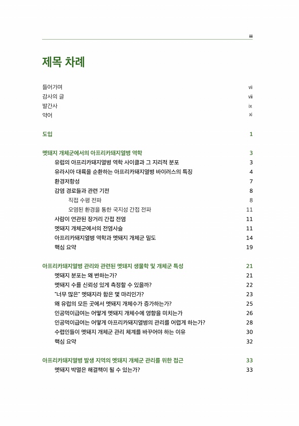iii 제목 차례 들어가며 ⅶ 감사의 글 ⅷ 발간사 ⅸ 약어 도입 1 멧돼지 개체군에서의 아프리카돼지열병 역학 3 유럽의 아프리카돼지열병 역학 사이클과 그 지리적 분포 3 유라시아 대륙을 순환하는 아프리카돼지열병 바이러스의 특징 4 환경저항성 7 감염 경로들과 관련 기전 8 직접 수평 전파 8 오염된 환경을 통한 국지성 간접 전파 11 사람이 연관된 장거리 간접 전염 11 멧돼지 개체군에서의 전염사슬 11 아프리카돼지열병 역학과 멧돼지 개체군 밀도 14 핵심 요약 19 아프리카돼지열병 관리와 관련된 멧돼지 생물학 및 개체군 특성 21 멧돼지 분포는 왜 변하는가? 21 멧돼지 수를 신뢰성 있게 측정할 수 있을까? 22 너무 많은멧돼지라 함은 몇 마리인가? 23 왜 유럽의 모든 곳에서 멧돼지 개체수가 증가하는가...