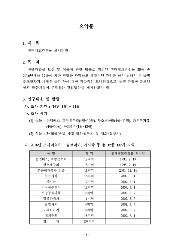 i 요약문 1. 제 목 생태계교란생물 모니터링 2. 목 적 생물다양성 보전 및 이용에 관한 법률로 지정된 생태계교란생물 20종 중 2016년에는 12종에 의한 영향을 파악하고 체계적인 관리를 하기 위해서 각 종별 분포현황과 개체수 증감 등에 대한 지속적인 모니터링으로, 종별 다양한 분포양 상과 확산기작에 부합하는 관리방안을 제시하고자 함 3. 연구내용 및 방법 가. 조사 기간 16년 1월 11월 나. 조사 시기 1 동물 큰입배스, 파랑볼우럭 4월10월 , 황소개구리 4월11월 , 붉은귀거북 4월10월 , 뉴트리아 1월12월 2 식물 310월 종별 개엽·영양생장기 및 개화·결실기 다. 2016년 조사지역수 뉴트리아, 가시박 등 총 12종 137개 지역 종 명 지 역 생태계교란생물 지정일 큰입배스, 파랑볼우럭 ...