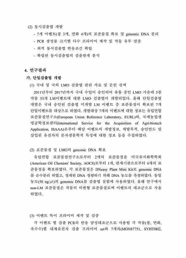 2 동시검출법 개발 7개 이벤트 콩 3개, 면화 4개 의 표준물질 확보 및 genomic DNA 분리 PCR 생성물 크기별 다수 프라이머 제작 및 작동 유무 검증 최적 동시검출법 반응조건 확립 확립된 동시검출법의 검출한계 분석 4. 연구결과 가. 단일검출법 개발 1 국내 및 국외 LMO 검출법 관련 자료 및 문헌 검색 2011년부터 2017년까지 국내 수입이 승인되어 유통 중인 LMO 가운데 5종 작물 53개 LM이벤트에 대한 LMO 검출법이 개발되었다. 올해 단일검출법 개발은 국내 승인된 검출법 미개발 LM 이벤트 중 표준물질이 확보된 7개 단일이벤트를 대상으로 하였다. 개발대상 7개의 이벤트에 대한 정보는 유럽연합 표준물질연구소 European Union Reference Laboratory, EURL ...