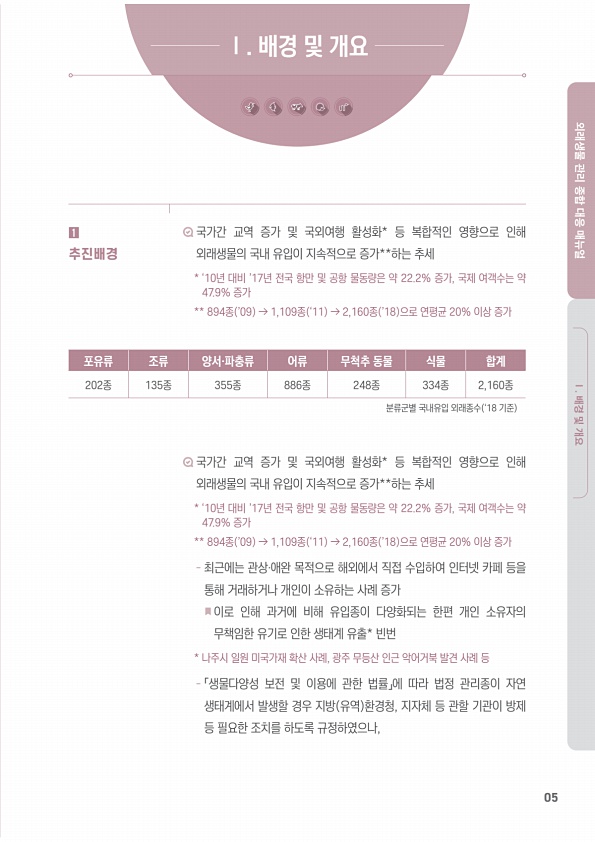 05 외래생물 관리 종합 대응 매뉴얼 Ⅰ. 배경 및 개요 Ⅰ. 배경 및 개요 ? 국가간 교역 증가 및 국외여행 활성화* 등 복합적인 영향으로 인해 외래생물의 국내 유입이 지속적으로 증가**하는 추세 * ‘10년 대비 ’17년 전국 항만 및 공항 물동량은 약 22.2% 증가, 국제 여객수는 약 47.9% 증가 ** 894종 ’09 → 1,109종 ‘11 → 2,160종 ’18 으로 연평균 20% 이상 증가 국가간 교역 증가 및 국외여행 활성화* 등 복합적인 영향으로 인해 외래생물의 국내 유입이 지속적으로 증가**하는 추세 * ‘10년 대비 ’17년 전국 항만 및 공항 물동량은 약 22.2% 증가, 국제 여객수는 약 47.9% 증가 ** 894종 ’09 → 1,109종 ‘11 → 2,160종 ’18 으로 연평균...