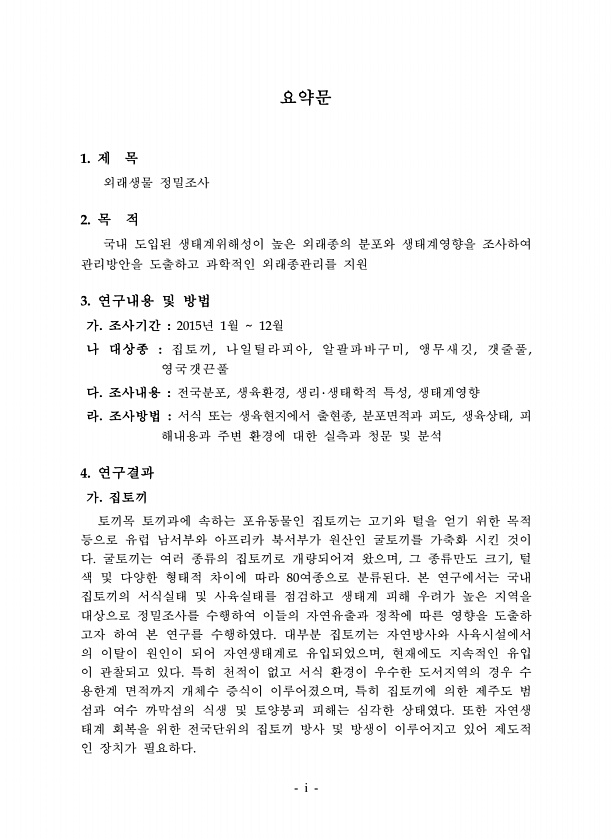 i 요약문 1. 제 목 외래생물 정밀조사 2. 목 적 국내 도입된 생태계위해성이 높은 외래종의 분포와 생태계영향을 조사하여 관리방안을 도출하고 과학적인 외래종관리를 지원 3. 연구내용 및 방법 가. 조사기간 2015년 1월 12월 나 대상종 집토끼, 나일틸라피아, 알팔파바구미, 앵무새깃, 갯줄풀, 영국갯끈풀 다. 조사내용 전국분포, 생육환경, 생리?생태학적 특성, 생태계영향 라. 조사방법 서식 또는 생육현지에서 출현종, 분포면적과 피도, 생육상태, 피 해내용과 주변 환경에 대한 실측과 청문 및 분석 4. 연구결과 가. 집토끼 토끼목 토끼과에 속하는 포유동물인 집토끼는 고기와 털을 얻기 위한 목적 등으로 유럽 남서부와 아프리카 북서부가 원산인 굴토끼를 가축화 시킨 것이 다. 굴토끼는 여러 종류의 집토끼로 개량...