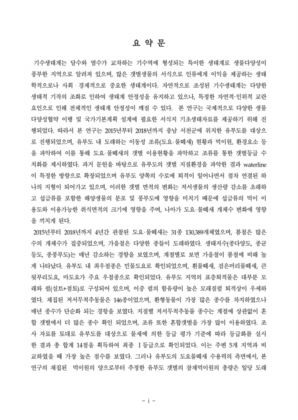 i 요 약 문 기수생태계는 담수와 염수가 교차하는 기수역에 형성되는 특이한 생태계로 생물다양성이 풍부한 지역으로 알려져 있으며, 많은 갯벌생물의 서식으로 인류에게 이익을 제공하는 생태 학적으로나 사회?경제적으로 중요한 생태계이다. 자연적으로 조성된 기수생태계는 다양한 생태적 기작의 조화로 인하여 생태계 안정성을 유지하고 있으나, 특정한 자연적·인위적 교란 요인으로 인해 전체적인 생태계 안정성이 깨질 수 있다. 본 연구는 국제적으로 다양한 생물 다양성협약 이행 및 국가기본계획 설계에 필요한 서식지 기초생태자료를 제공하기 위해 진 행되었다. 따라서 본 연구는 2015년부터 2018년까지 충남 서천군에 위치한 유부도를 대상으 로 진행되었으며, 유부도 내 도래하는 이동성 조류 도요 물떼새 현황과 먹이원, 환경요소 ...