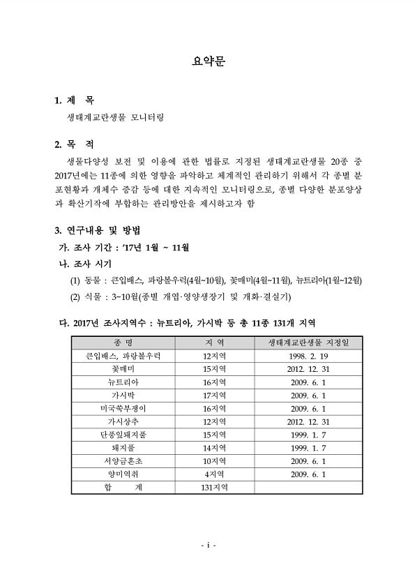 i 요약문 1. 제 목 생태계교란생물 모니터링 2. 목 적 생물다양성 보전 및 이용에 관한 법률로 지정된 생태계교란생물 20종 중 2017년에는 11종에 의한 영향을 파악하고 체계적인 관리하기 위해서 각 종별 분 포현황과 개체수 증감 등에 대한 지속적인 모니터링으로, 종별 다양한 분포양상 과 확산기작에 부합하는 관리방안을 제시하고자 함 3. 연구내용 및 방법 가. 조사 기간 17년 1월 11월 나. 조사 시기 1 동물 큰입배스, 파랑볼우럭 4월10월 , 꽃매미 4월11월 , 뉴트리아 1월12월 2 식물 310월 종별 개엽·영양생장기 및 개화·결실기 다. 2017년 조사지역수 뉴트리아, 가시박 등 총 11종 131개 지역 종 명 지 역 생태계교란생물 지정일 큰입배스, 파랑볼우럭 12지역 1998. 2. 19 ...