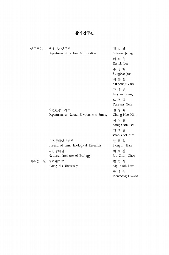 참여연구진 연구책임자 생태진화연구부 Department of Ecology & Evolution 정 길 상 Gilsang Jeong 이 은 옥 Eunok Lee 주 성 배 Sungbae Joo 최 유 성 Yu-Seong Choi 강 재 연 Jaeyeon Kang 노 푸 름 Pureum Noh 자연환경조사부 Department of Natural Environments Survey 김 창 회 Chang-Hoe Kim 이 상 연 Sang-Yeon Lee 김 우 열 Woo-Yuel Kim 기초생태연구본부 Bureau of Basic Ecological Research 한 동 욱 Donguk Han 국립생태원 National Institute of Ecology 최 재 천 Jae Chun Choe 외부연구원 경희대...