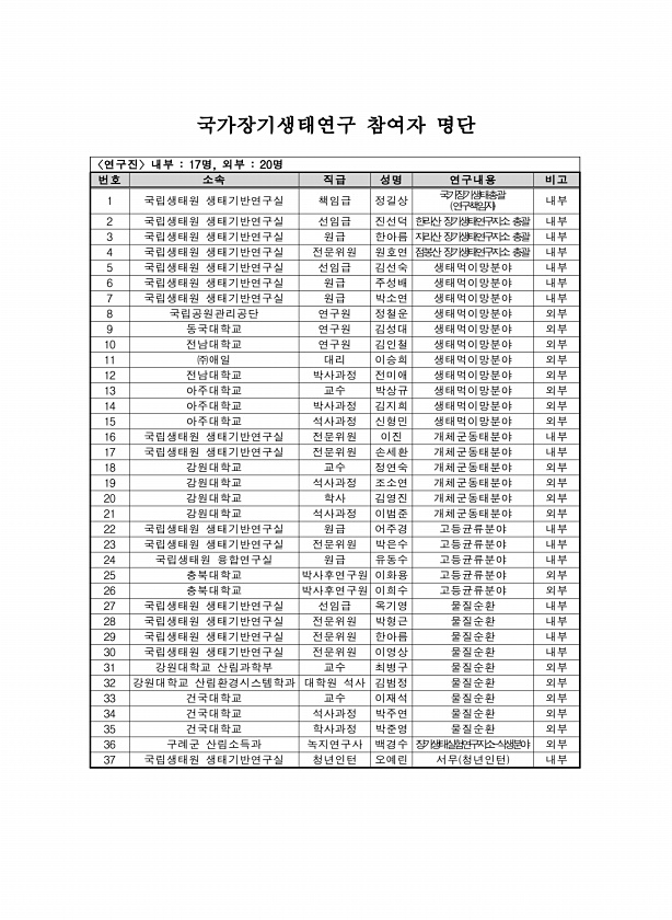 국가장기생태연구 참여자 명단 〈연구진〉내부 17명, 외부 20명 번호 소속 직급 성명 연구내용 비고 1 국립생태원 생태기반연구실 책임급 정길상 국가장기생태총괄 연구책임자 내부 2 국립생태원 생태기반연구실 선임급 진선덕 한라산 장기생태연구지소 총괄 내부 3 국립생태원 생태기반연구실 원급 한아름 지리산 장기생태연구지소 총괄 내부 4 국립생태원 생태기반연구실 전문위원 원호연 점봉산 장기생태연구지소 총괄 내부 5 국립생태원 생태기반연구실 선임급 김선숙 생태먹이망분야 내부 6 국립생태원 생태기반연구실 원급 주성배 생태먹이망분야 내부 7 국립생태원 생태기반연구실 원급 박소연 생태먹이망분야 내부 8 국립공원관리공단 연구원 정철운 생태먹이망분야 외부 9 동국대학교 연구원 김성대 생태먹이망분야 외부 10 전남대학교 연구원 ...