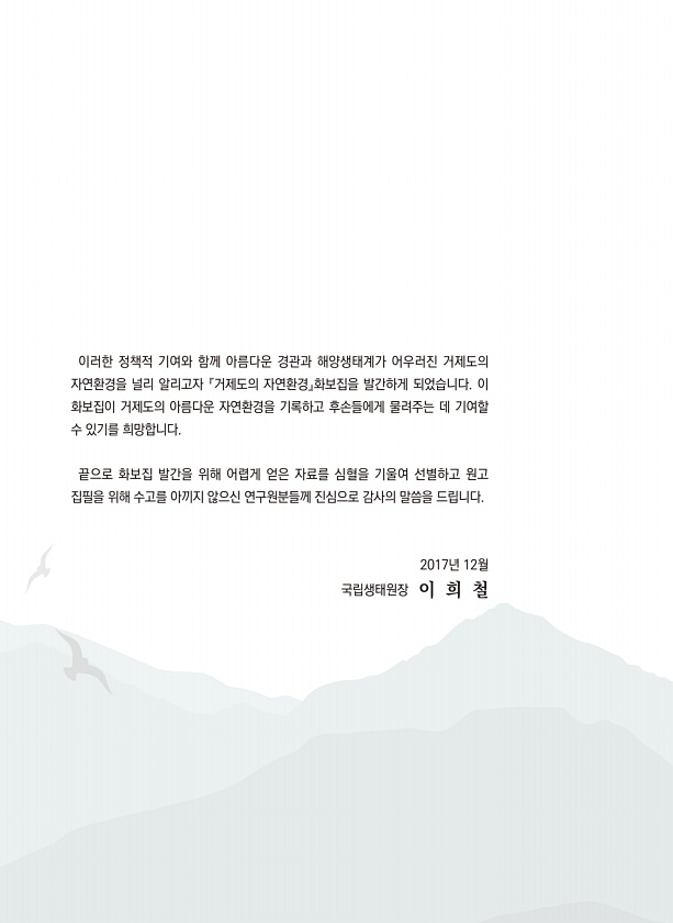이러한 정책적 기여와 함께 아름다운 경관과 해양생태계가 어우러진 거제도의 자연환경을 널리 알리고자 『거제도의 자연환경』화보집을 발간하게 되었습니다. 이 화보집이 거제도의 아름다운 자연환경을 기록하고 후손들에게 물려주는 데 기여할 수 있기를 희망합니다. 끝으로 화보집 발간을 위해 어렵게 얻은 자료를 심혈을 기울여 선별하고 원고 집필을 위해 수고를 아끼지 않으신 연구원분들께 진심으로 감사의 말씀을 드립니다. 2017년 12월 국립생태원장 이 희철