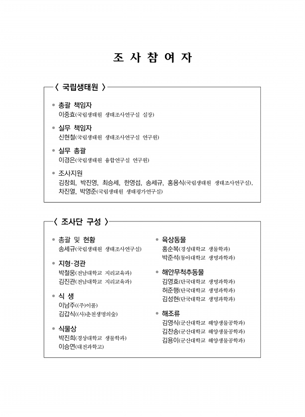 조 사 참 여 자 국립생태원 ? 총괄 책임자 이중효 국립생태원 생태조사연구실 실장 ? 실무 책임자 신현철 국립생태원 생태조사연구실 연구원 ? 실무 총괄 이경은 국립생태원 융합연구실 연구원 ? 조사지원 김창회, 박진영, 최승세, 한영섭, 송세규, 홍용식 국립생태원 생태조사연구실 , 차진열, 박영준 국립생태원 생태평가연구실 조사단 구성 ? 총괄 및 현황 송세규 국립생태원 생태조사연구실 ? 지형·경관 박철웅 전남대학교 지리교육과 김진관 전남대학교 지리교육과 ? 식 생 이남주 주 이풀 김갑식 사 춘천생명의숲 ? 식물상 박진희 경상대학교 생물학과 이승연 대전과학고 ? 육상동물 홍순복 경성대학교 생물학과 박준석 동아대학교 생명과학과 ? 해안무척추동물 김영효 단국대학교 생명과학과 허준행 단국대학교 생명과학과 김성현 단국...