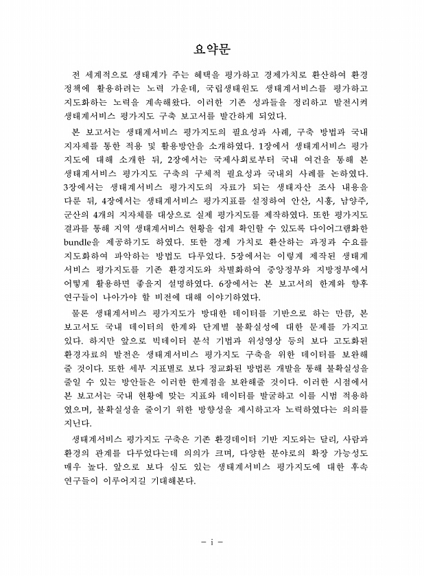 요약문 전 세계적으로 생태계가 주는 혜택을 평가하고 경제가치로 환산하여 환경 정책에 활용하려는 노력 가운데, 국립생태원도 생태계서비스를 평가하고 지도화하는 노력을 계속해왔다. 이러한 기존 성과들을 정리하고 발전시켜 생태계서비스 평가지도 구축 보고서를 발간하게 되었다. 본 보고서는 생태계서비스 평가지도의 필요성과 사례, 구축 방법과 국내 지자체를 통한 적용 및 활용방안을 소개하였다. 1장에서 생태계서비스 평가 지도에 대해 소개한 뒤, 2장에서는 국제사회로부터 국내 여건을 통해 본 생태계서비스 평가지도 구축의 구체적 필요성과 국내외 사례를 논하였다. 3장에서는 생태계서비스 평가지도의 자료가 되는 생태자산 조사 내용을 다룬 뒤, 4장에서는 생태계서비스 평가지표를 설정하여 안산, 시흥, 남양주, 군산의 4개의 지자...