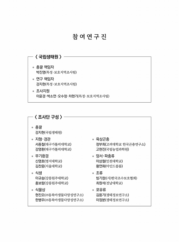 참 여 연 구 진 국립생태원 ? 총괄 책임자 박진영 특정·보호지역조사팀 ? 연구 책임자 강지현 특정?보호지역조사팀 ? 조사지원 이윤경?박소연?오수정?차현기 특정?보호지역조사팀 조사단 구성 ? 총괄 강지현 국립생태원 ? 지형?경관 서종철 대구가톨릭대학교 강영환 대구가톨릭대학교 ? 무기환경 신영호 명지대학교 김찬웅 서울대학교 ? 식생 이규송 강릉원주대학교 홍보람 강릉원주대학교 ? 식물상 현진오 ㈜동북아생물다양성연구소 한병우 ㈜동북아생물다양성연구소 ? 육상곤충 정부희 고려대학교 한국곤충연구소 고현진 국립농업과학원 ? 양서?파충류 이상철 인천대학교 황연화 마인드블룸 ? 조류 빙기창 사 한국조수보호협회 최원석 전남대학교 ? 포유류 김용기 생태정보연구소 이정분 생태정보연구소