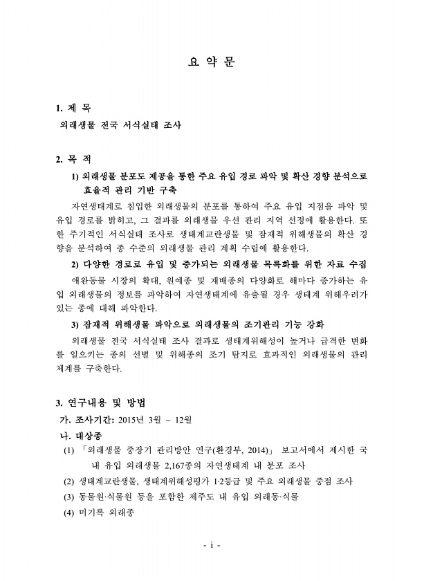 i 요 약 문 1. 제 목 외래생물 전국 서식실태 조사 2. 목 적 1 외래생물 분포도 제공을 통한 주요 유입 경로 파악 및 확산 경향 분석으로 효율적 관리 기반 구축 자연생태계로 침입한 외래생물의 분포를 통하여 주요 유입 지점을 파악 및 유입 경로를 밝히고, 그 결과를 외래생물 우선 관리 지역 선정에 활용한다. 또 한 주기적인 서식실태 조사로 생태계교란생물 및 잠재적 위해생물의 확산 경 향을 분석하여 종 수준의 외래생물 관리 계획 수립에 활용한다. 2 다양한 경로로 유입 및 증가되는 외래생물 목록화를 위한 자료 수집 애완동물 시장의 확대, 원예종 및 재배종의 다양화로 해마다 증가하는 유 입 외래생물의 정보를 파악하여 자연생태계에 유출될 경우 생태계 위해우려가 있는 종에 대해 파악한다. 3 잠재적 위해생물 ...