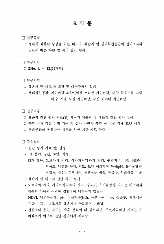 i 요 약 문 □ 연구목적 ○ 생태계 회복력 향상을 위한 대조지, 훼손지 및 생태복원공간의 실태조사와 진단에 따른 복원 및 관리 방안 제시 □ 연구기간 ○ 2016. 1. ∼ 12. 12개월 □ 연구지역 ○ 훼손지 및 대조지대전 및 대구광역시 일대 ○ 생태복원공간자연마당 4개소 익산 소라산 자연마당, 대구 불로고분 자연 마당, 서울 노원 자연마당, 부산 이기대 자연마당 □ 연구내용 ○ 훼손지 진단 평가 지표 안 제시와 훼손지 및 대조지 진단 평가 실시 ○ 복원 식재 식물 선정 기준 및 절차 마련과 복원 시 식물 식재 모델 제시 ○ 생태공간의 복원방안 제시를 위한 기반 자료 구축 □ 주요결과 ○ 진단 평가 지표 안 선정 3개 분야경관, 토양, 식생 12개 항목도로와의 거리, 시가화지역과의 거리, 주변지역 식생...