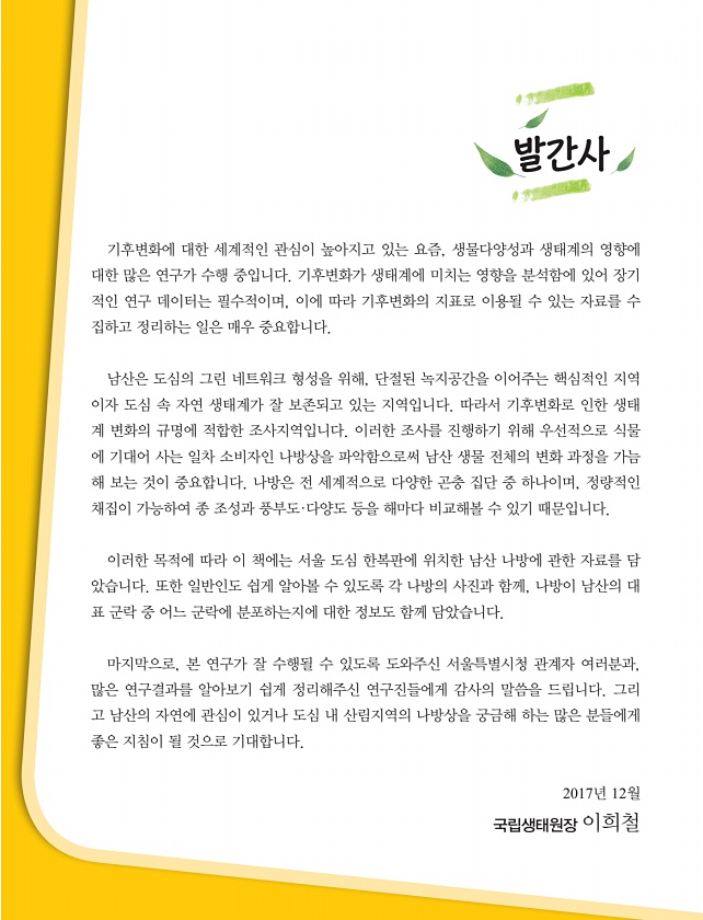 기후변화에 대한 세계적인 관심이 높아지고 있는 요즘, 생물다양성과 생태계의 영향에 대한 많은 연구가 수행 중입니다. 기후변화가 생태계에 미치는 영향을 분석함에 있어 장기 적인 연구 데이터는 필수적이며, 이에 따라 기후변화의 지표로 이용될 수 있는 자료를 수 집하고 정리하는 일은 매우 중요합니다. 남산은 도심의 그린 네트워크 형성을 위해, 단절된 녹지공간을 이어주는 핵심적인 지역 이자 도심 속 자연 생태계가 잘 보존되고 있는 지역입니다. 따라서 기후변화로 인한 생태 계 변화의 규명에 적합한 조사지역입니다. 이러한 조사를 진행하기 위해 우선적으로 식물 에 기대어 사는 일차 소비자인 나방상을 파악함으로써 남산 생물 전체의 변화 과정을 가늠 해 보는 것이 중요합니다. 나방은 전 세계적으로 다양한 곤충 집단 중 하나...
