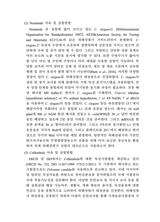 2 Nematode 사육 및 실험방법 Nematode 중 실험에 많이 쓰이고 있는 C. elegans는 ISO International Organization for Standardization 10872, ASTM American Society for Testing and Materials E2172-01과 같은 위해성평가 가이드라인이 존재한다. C. elegans는 유전자 수준에서 포유류와 광범위하게 상동성을 가지고 있으며 간 단하게 사육 및 유지 관리 할 수 ? 있다. 그리고 저렴하고 간단한 실험 설계로 여러 농도와 노출 시간을 동시에 평가할 수 있다. 또한 수명주기가 짧아서 몇 년이 아닌 몇 주안에 수명이나 여러 세대를 이용한 실험이 가능하다. 투 명한 조직과 이미 알려진 신체 및 연결조직, 세포 및...
