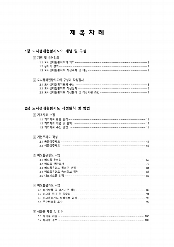 제 목 차 례 1장 도시생태현황지도의 개념 및 구성 개념 및 용어정의 1.1 도시생태현황지도의 의의 ············································································································· 3 1.2 용어의 정의 ····································································································································· 3 1.3 도시생태현황지도 작성주체 및 대상 ······························································...