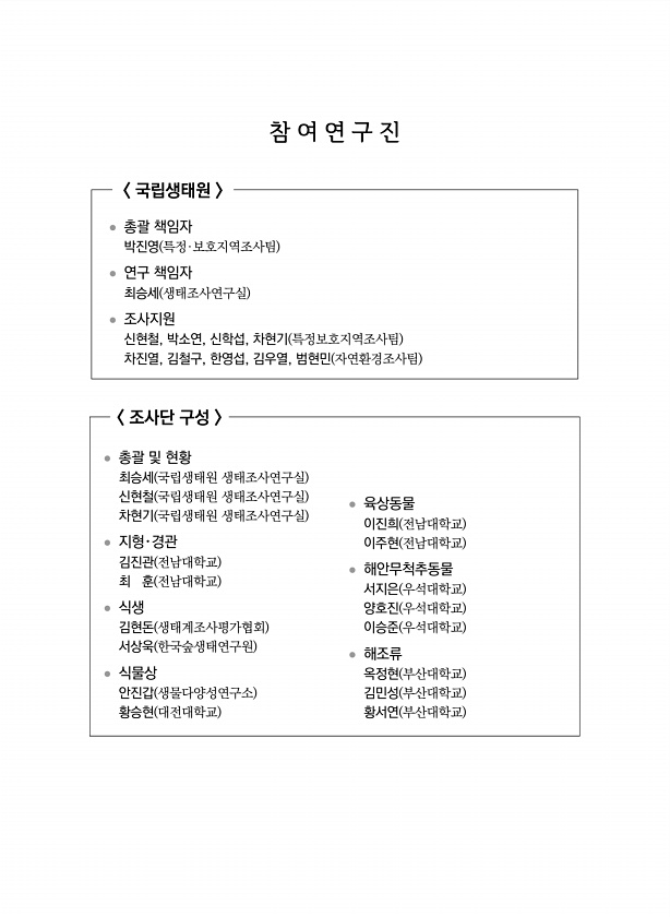 참 여 연 구 진 국립생태원 ? 총괄 책임자 박진영 특정·보호지역조사팀 ? 연구 책임자 최승세 생태조사연구실 ? 조사지원 신현철, 박소연, 신학섭, 차현기 특정보호지역조사팀 차진열, 김철구, 한영섭, 김우열, 범현민 자연환경조사팀 조사단 구성 ? 총괄 및 현황 최승세 국립생태원 생태조사연구실 신현철 국립생태원 생태조사연구실 차현기 국립생태원 생태조사연구실 ? 지형?경관 김진관 전남대학교 최 훈 전남대학교 ? 식생 김현돈 생태계조사평가협회 서상욱 한국숲생태연구원 ? 식물상 안진갑 생물다양성연구소 황승현 대전대학교 ? 육상동물 이진희 전남대학교 이주현 전남대학교 ? 해안무척추동물 서지은 우석대학교 양호진 우석대학교 이승준 우석대학교 ? 해조류 옥정현 부산대학교 김민성 부산대학교 황서연 부산대학교