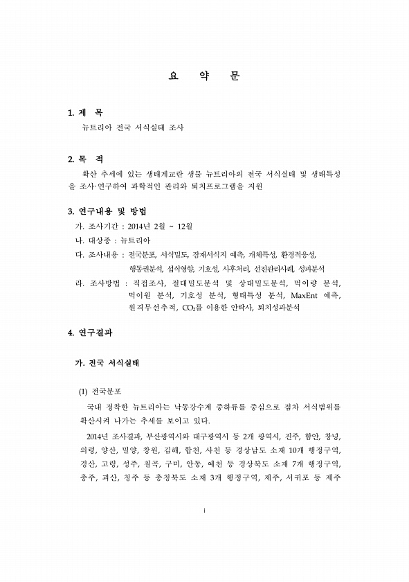 i 요 약 문 1. 제 목 뉴트리아 전국 서식실태 조사 2. 목 적 확산 추세에 있는 생태계교란 생물 뉴트리아의 전국 서식실태 및 생태특성 을 조사·연구하여 과학적인 관리와 퇴치프로그램을 지원 3. 연구내용 및 방법 가. 조사기간 2014년 2월 12월 나. 대상종 뉴트리아 다. 조사내용 전국분포, 서식밀도, 잠재서식지 예측, 개체특성, 환경적응성, 행동권분석, 섭식영향, 기호성, 사후처리, 선진관리사례, 성과분석 라. 조사방법 직접조사, 절대밀도분석 및 상대밀도분석, 먹이량 분석, 먹이원 분석, 기호성 분석, 형태특성 분석, MaxEnt 예측, 원격무선추적, CO2를 이용한 안락사, 퇴치성과분석 4. 연구결과 가. 전국 서식실태 1 전국분포 국내 정착한 뉴트리아는 낙동강수계 중하류를 중심으로 점차 서식범위...