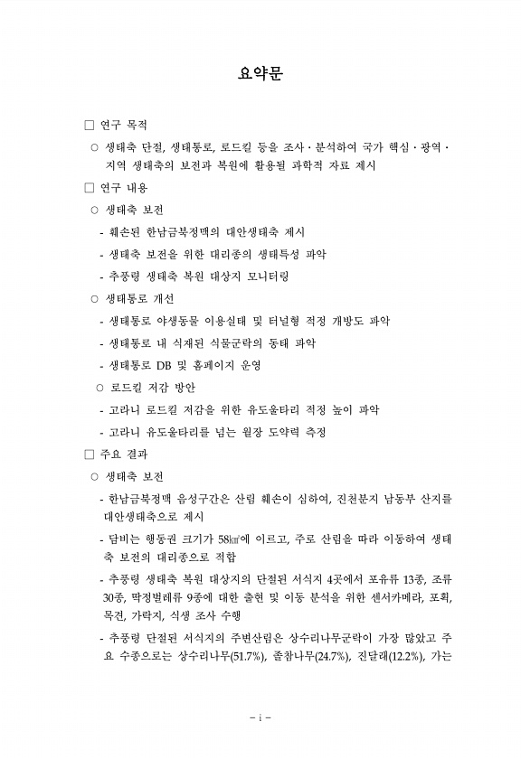 -- i ii 요약문 연구 목적 생태축 단절 생태통로 로드킬 등을 조사 분석하여 국가 핵심 광역 지역 생태축의 보전과 복원에 활용될 과학적 자료 제시 연구 내용 생태축 보전 훼손된 한남금북정맥의 대안생태축 제시 생태축 보전을 위한 대리종의 생태특성 파악 추풍령 생태축 복원 대상지 모니터링 생태통로 개선 생태통로 야생동물 이용실태 및 터널형 적정 개방도 파악 생태통로 내 식재된 식물군락의 동태 파악 생태통로 및 홈페이지 운영 로드킬 저감 방안 고라니 로드킬 저감을 위한 유도울타리 적정 높이 파악 고라니 유도울타리를 넘는 월장 도약력 측정 주요 결과 생태축 보전 한남금북정맥 음성구간은 산림 훼손이 심하여 진천분지 남동부 산지를 대안생태축으로 제시 담비는 행동권 크기가 에 이르고 주로 산림을 따라 이동하여 생태 ...
