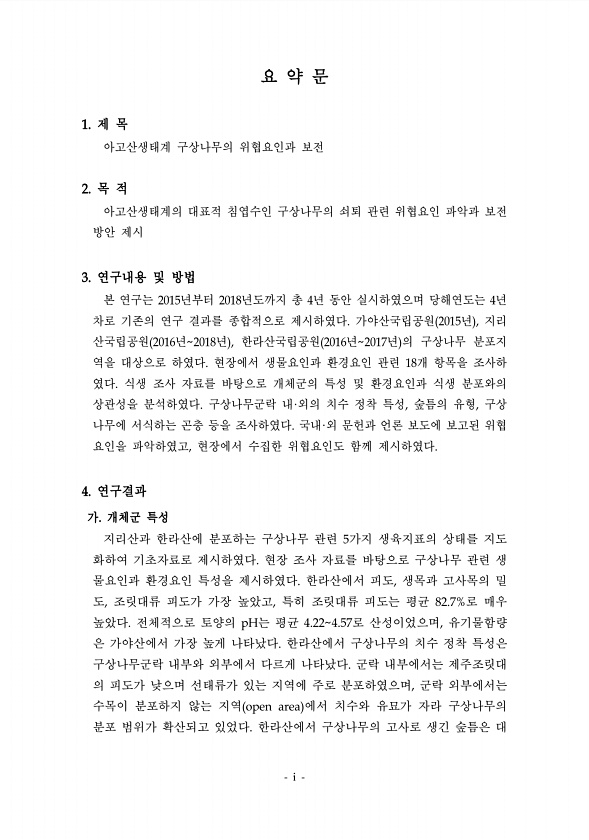 i 요 약 문 1. 제 목 아고산생태계 구상나무의 위협요인과 보전 2. 목 적 아고산생태계의 대표적 침엽수인 구상나무의 쇠퇴 관련 위협요인 파악과 보전 방안 제시 3. 연구내용 및 방법 본 연구는 2015년부터 2018년도까지 총 4년 동안 실시하였으며 당해연도는 4년 차로 기존의 연구 결과를 종합적으로 제시하였다. 가야산국립공원 2015년 , 지리 산국립공원 201N년2018년 , 한라산국립공원 201N년2017년 의 구상나무 분포지 역을 대상으로 하였다. 현장에서 생물요인과 환경요인 관련 18개 항목을 조사하 였다. 식생 조사 자료를 바탕으로 개체군의 특성 및 환경요인과 식생 분포와의 상관성을 분석하였다. 구상나무군락 내·외의 치수 정착 특성, 숲틈의 유형, 구상 나무에 서식하는 곤충 등을 조사하였다. ...